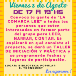 – El viernes 3 de Agosto: 17 hs TALLER DE LECTURA “LA COMARCA LEE” con Silvina Alonso