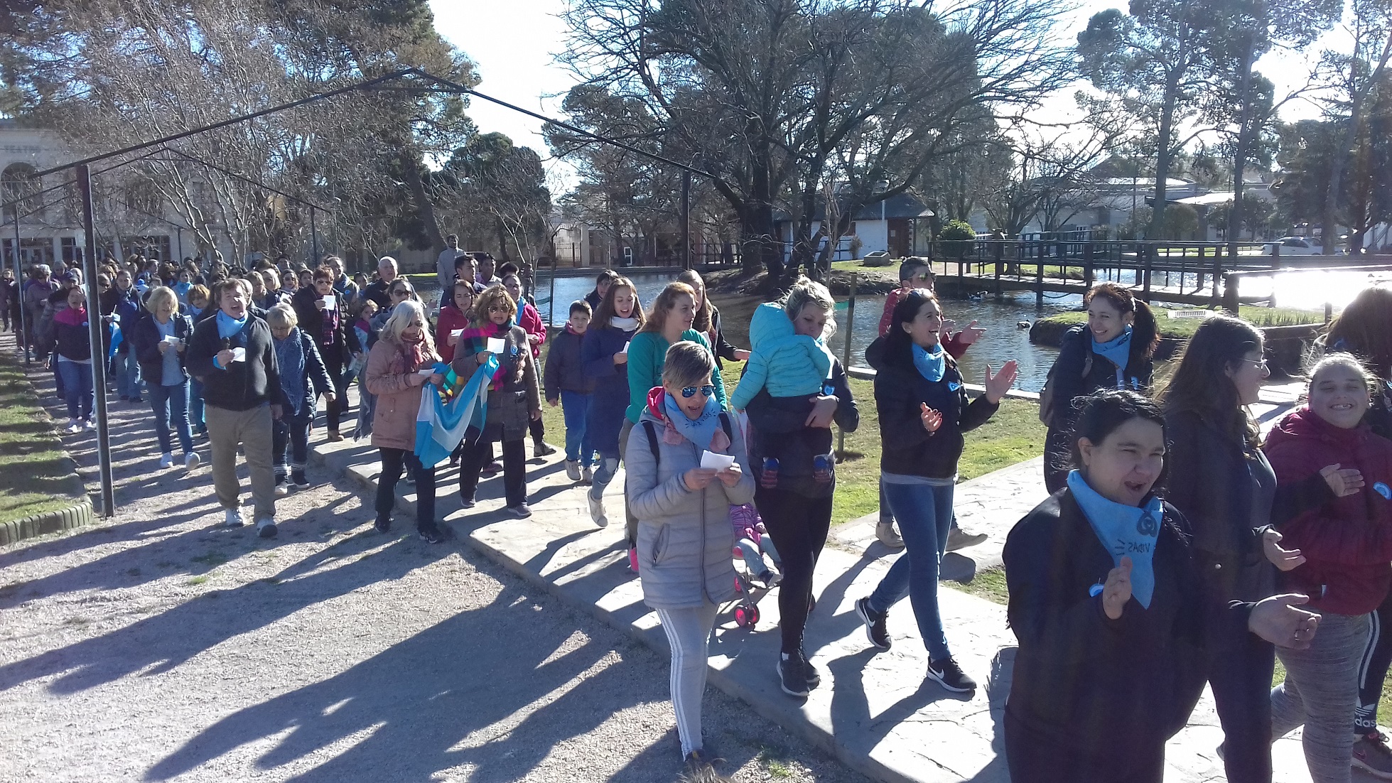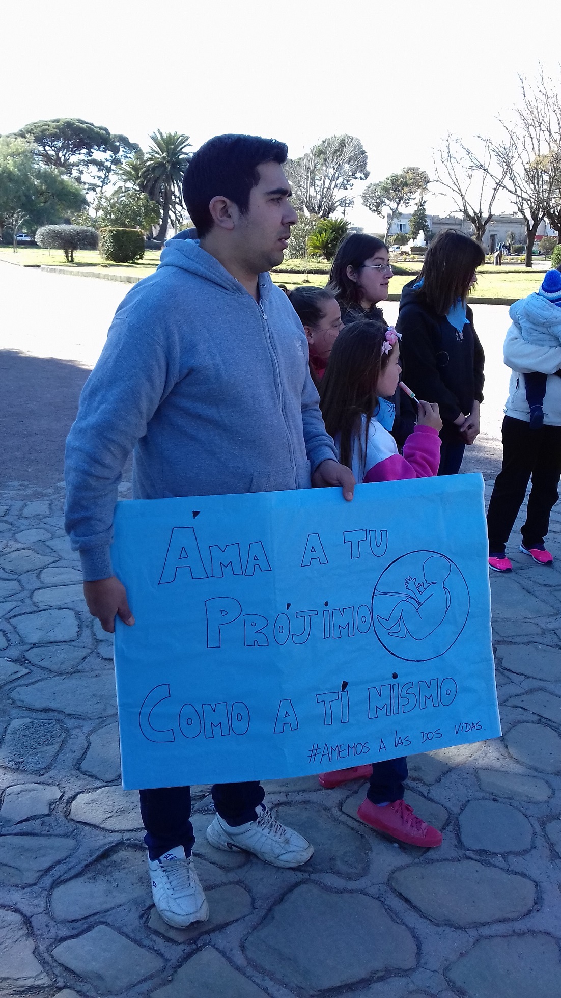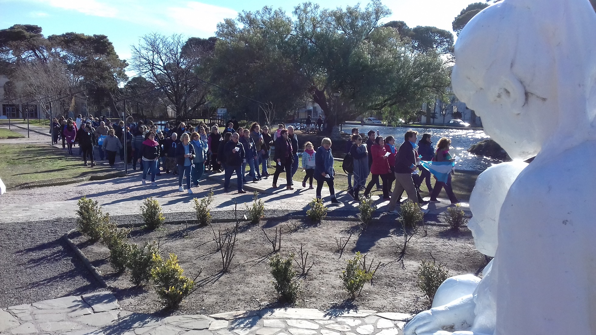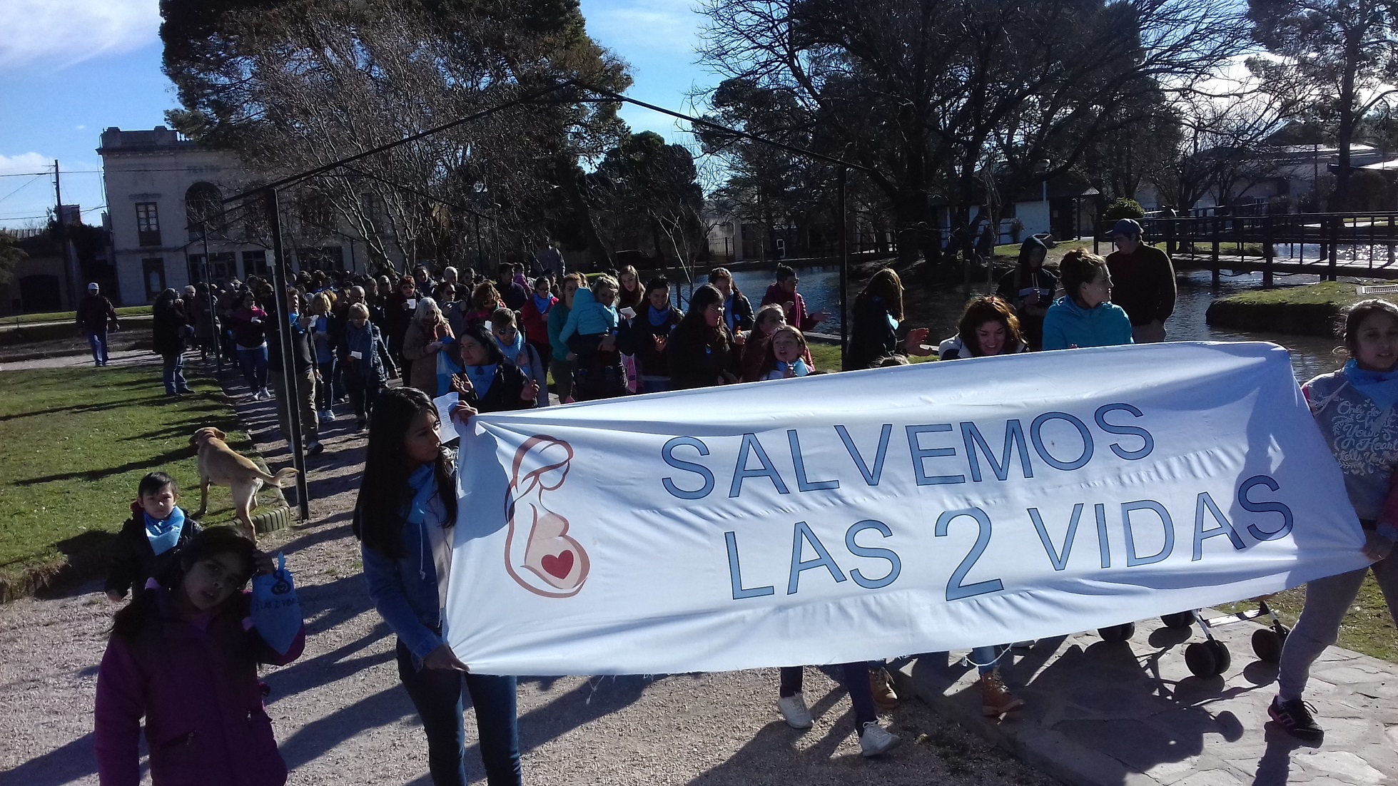 Tras la concentración, grandes y chicos, comenzaron una caminata hasta el monumento a la Familia, ubicada a escasos metros del lago de la plaza, portando pañuelos celestes, banderas argentinas y carteles con inscripciones a favor de las dos vidas.