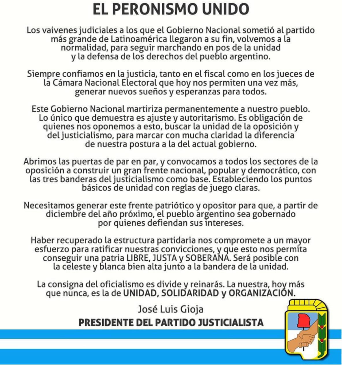 Desde la secretaría de prensa del Partido Justicialista de Tornquist enviaron para su publicación el mensaje de José Luis Gioja, presidente del Partido Justicialista