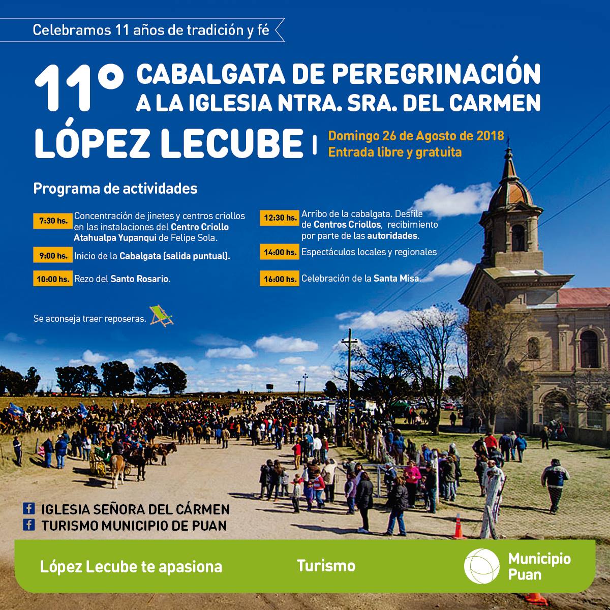 Será el domingo 26 de agosto. Desde las 7:30 hs. se concentrarán los jinetes en las instalaciones del Centro Criollo “Atahualpa Yupanqui” de Felipe Sola. A las 9 hs. (horario de salida puntual) se iniciará la Cabalgata, para estar arribando 12.30 a la Iglesia Nuestra Señora del Carmen de López Lecube y comenzar con el desfile de jinetes.