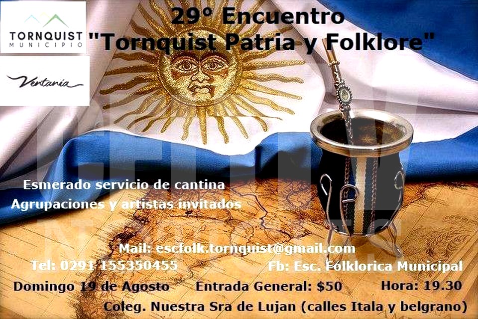 La Dirección de Cultura te invita a disfrutar del tradicional encuentro de folclore “Tornquist Patria y Folclore”, que llevará a cabo la Escuela Folclorica Municipal en domingo 19 de agosto en las instalaciones del Colegio Nrta. Sra de Lujan (Italia y Belgrano). Dicho evento dará comienzo a las 19.30hs y contará con artistas invitados y cantina. Entrada general $50.