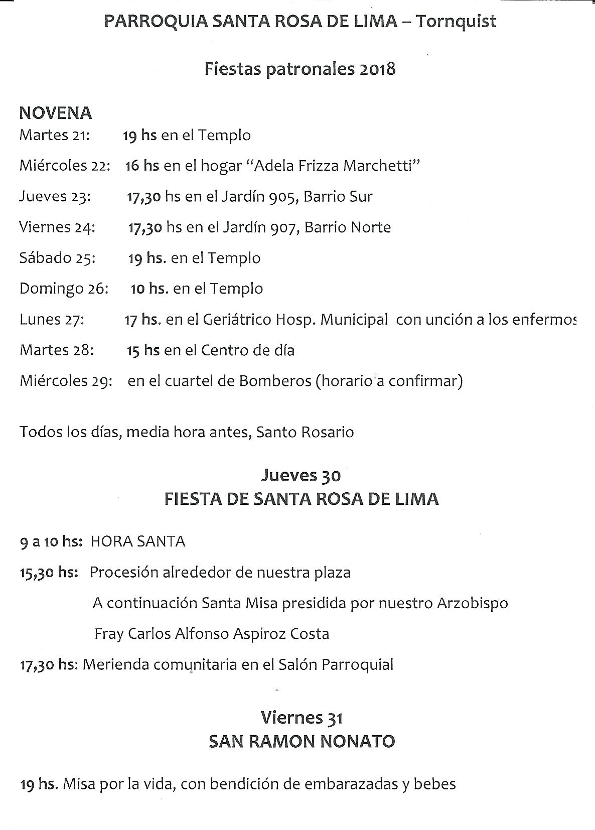 CELTTV— La parroquia Santa Rosa de Lima de Tornquist, dio a conocer el programa con las distintas actividades que se desarrollarán durante la novena de las Fiestas Patronales, desde el 21 al 30 de agosto.