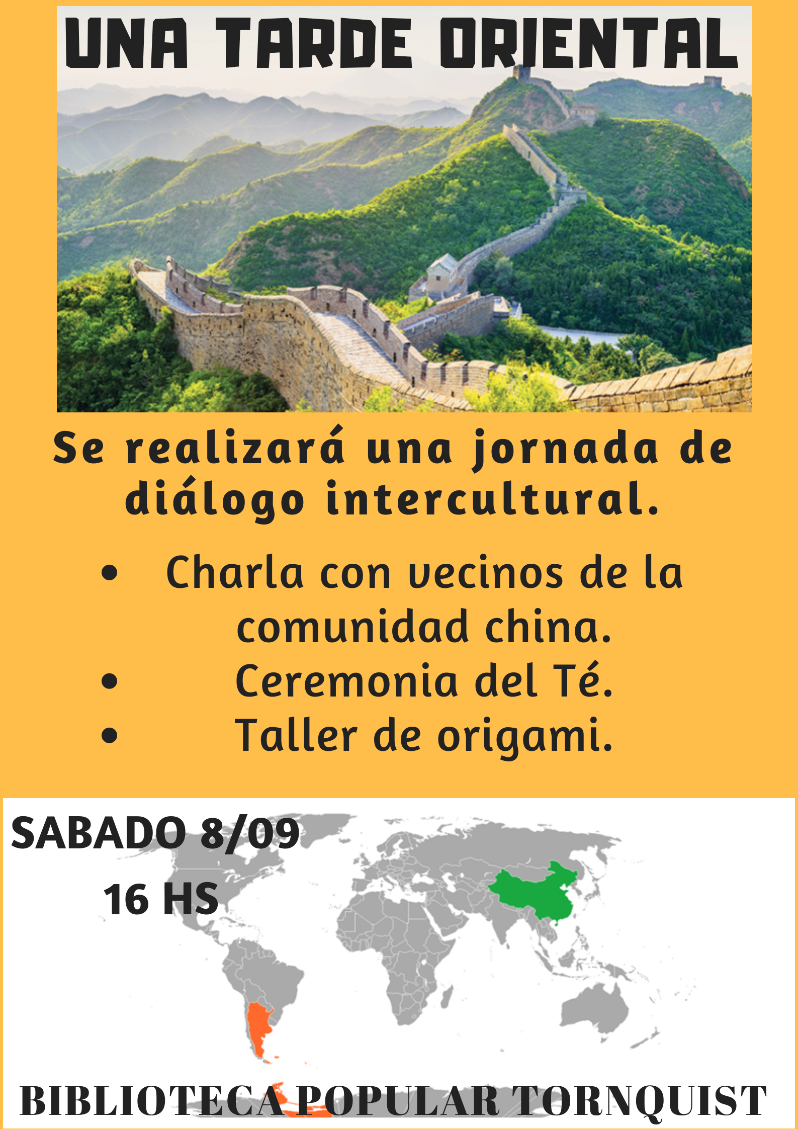 “Una tarde Oriental”: se realizará una jornada de diálogo intercultural. Habrá una charla con vecinos de la comunidad China, se realizará una ceremonia del Té y para finalizar un taller de origami.