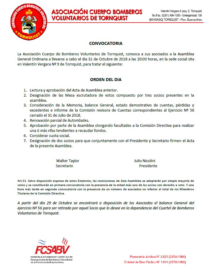 CELTTV--- La Asociación Cuwerpo Bomberos Voluntarios de Tornquist, realizará su asamblea general ordinaria, el 31 de octubre, a partir de las 20, en su sede social. <a href="http://www.celttv.com.ar/?attachment_id=37485" rel="attachment wp-att-37485"><img class="alignleft size-medium wp-image-37485" src="http://www.celttv.com.ar/wp-content/uploads/2018/09/asamblea18-600x780.jpg" alt="" width="600" height="780" /></a>