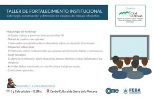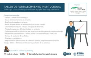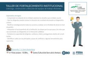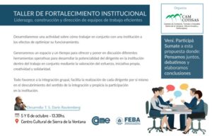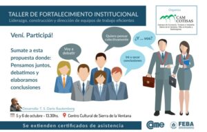 CELT TV- En el marco de los festejos de nuestro 4º aniversario de Camcotisas se está organizando un taller de “Fortalecimiento Institucional”,el mismo estará orientado a dirigentes de las cámaras y asociaciones e instituciones intermedias de nuestro distrito como así también miembros del cuerpo de las distintas áreas del municipio que deseen participar.. El mismo se realizara los días 5 y 6 de octubre en instalaciones del Centro Cultural Sierra de la Ventana, de 13.30 hs a 17 hs.