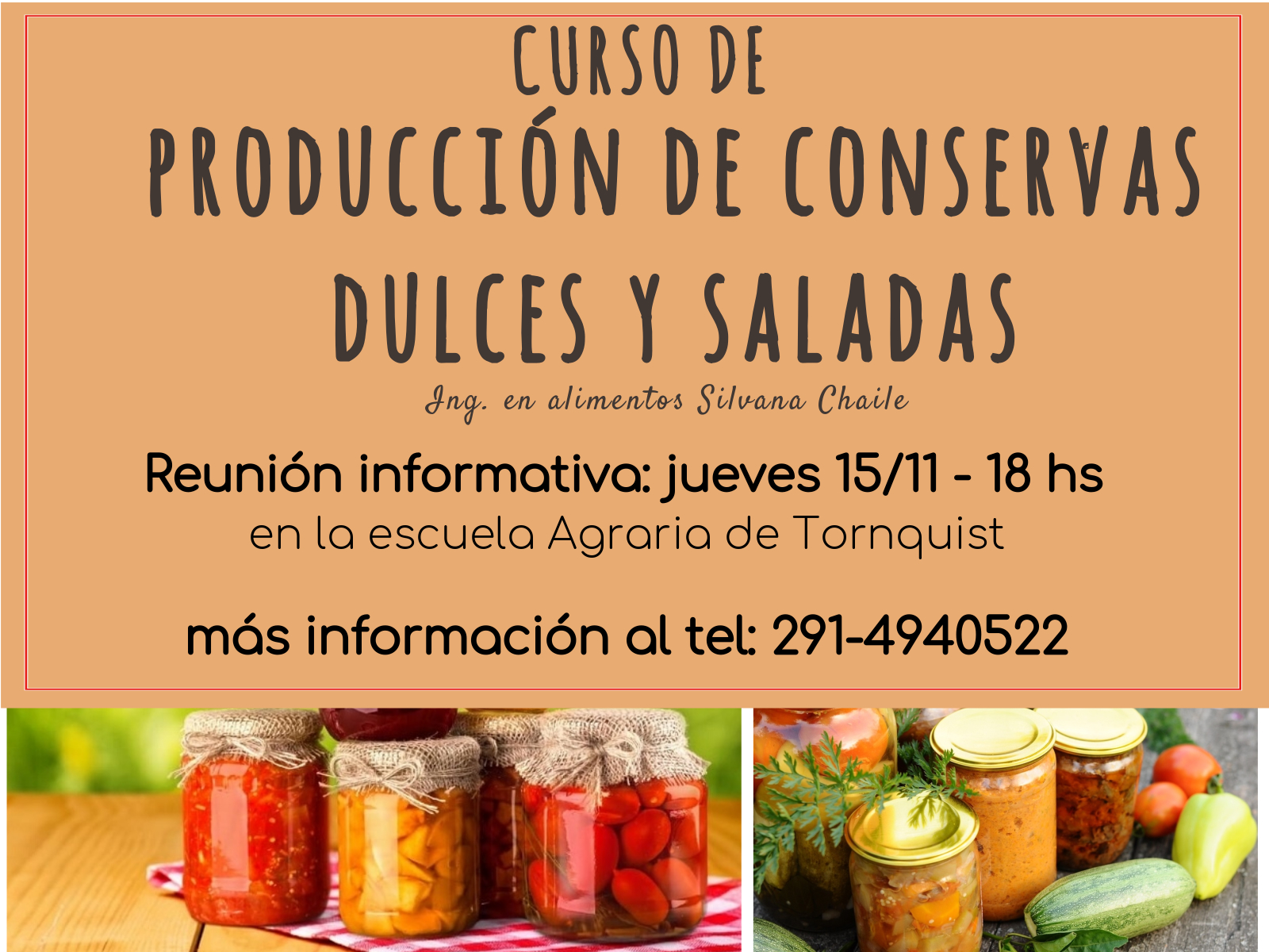 La Escuela de Educación Secundaria Agraria Nº 1 y la Ingeniera en Alimentos Silvana Chaile invitan a la comunidad a participar del curso de Producción de conservas dulces y saladas, en el marco de Educación no formal, a realizarse en la sede Tornquist de la EESA Nº 1 Av. Ameghino 1090. El día jueves 15/11 a las 18 hs se realizará una reunión informativa en la que se definirá el día y horario a dictarse el curso.