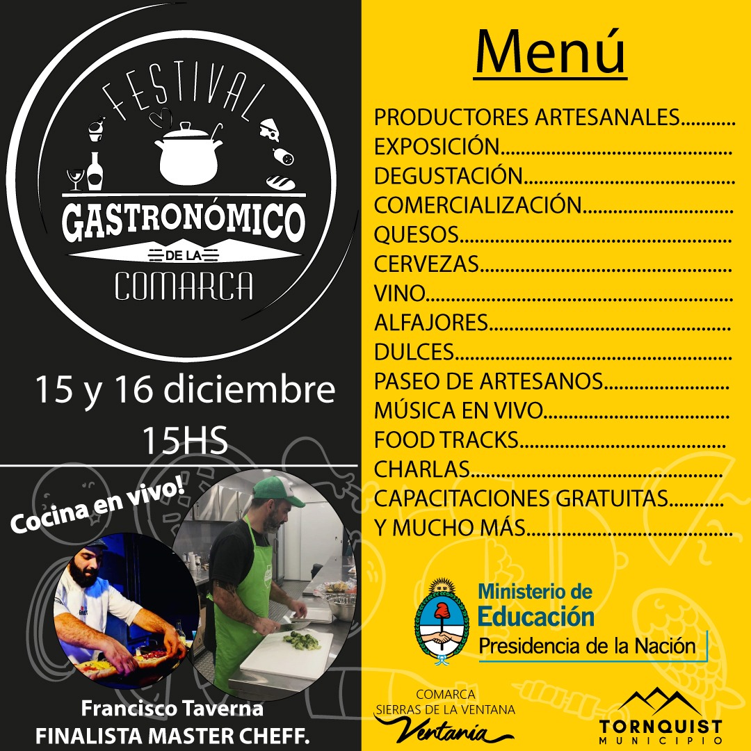 Desde la Secretaría de Turismo del Municipio de Tornquist se invita a productores artesanales, músicos, artesanos y manualistas del distrito, participar del 1° Festival de Gastronómico de la Comarca, que se llevará a cabo los días 15 y 16 de diciembre en el predio del Centro Cultural de Sierra de la Ventana. El propósito del mismo, es revalorizar las raíces, la identidad y la historia, enfatizando la rica producción artesanal de nuestra Comarca.