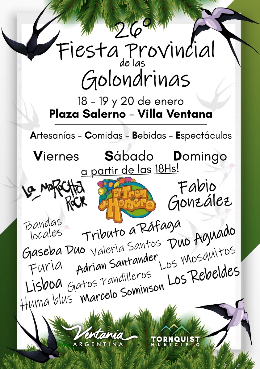 Tornquist Municipio, a través de la Secretaría de Turismo, invita a productores regionales, manualistas y artesanos del distrito (no reventa), a participar de la 26° Fiesta Provincial de las Golondrinas, que se llevará a cabo los días 18,19 y 20 de enero en la Plaza Salerno de Villa Ventana.