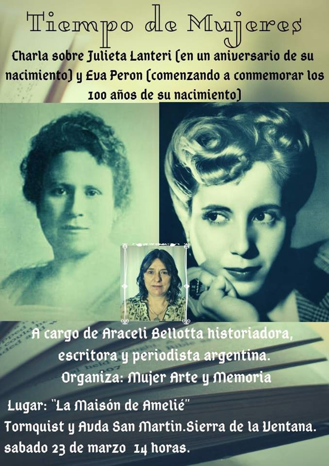 el 23 de marzo a las 14 horas en La Maison de Amelie, Tornquist y Avda. San Martín, Sierra de la Ventana en el marco de los 136 años de Julieta Lanteri y de la conmemoración del centenario del nacimiento de Evita el próximo 7 de mayo.