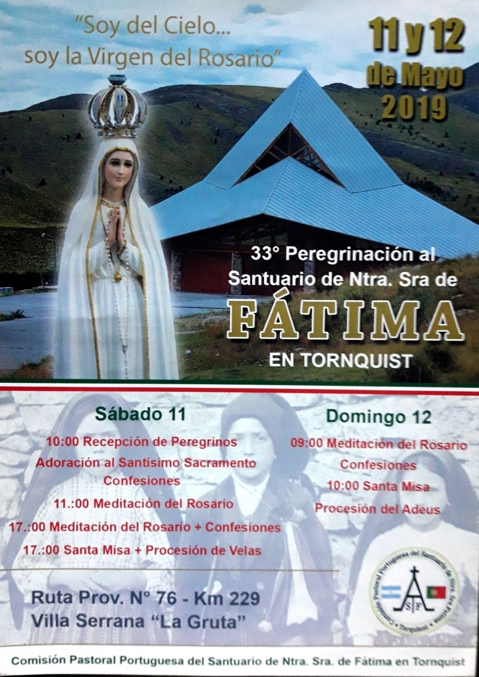 La Comisión Directiva de la Sociedad de Fomento y Turismo de Villa Serrana La Gruta, invita a los vecinos del distrito a participar de la Peregrinación al Santuario Nuestra Señora de Fatima, previsto para los días 11 y 12 de mayo del 2019. Habrá ademas, como todos los años, paseo de artesanos y oferta gastronómica para disfrutar en familia.