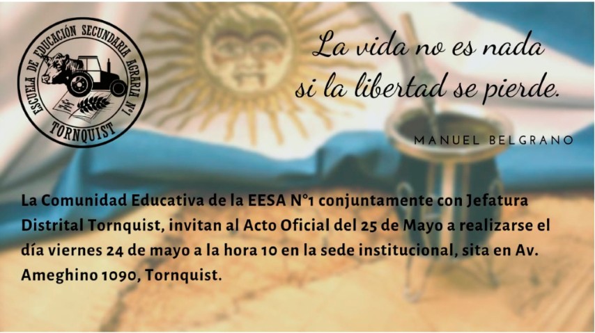 La Comunidad Educativa de la Escuela de Educación Secundaria Agraria Nº1, conjuntamente con jefatura distrital Tornquist, invitan al Acto Oficial del 25 de Mayo a realizarse el día viernes 24 de mayo a la hora 10 en la sede de la institución educativa ubicada en Ameghino 1090 de nuestra ciudad.