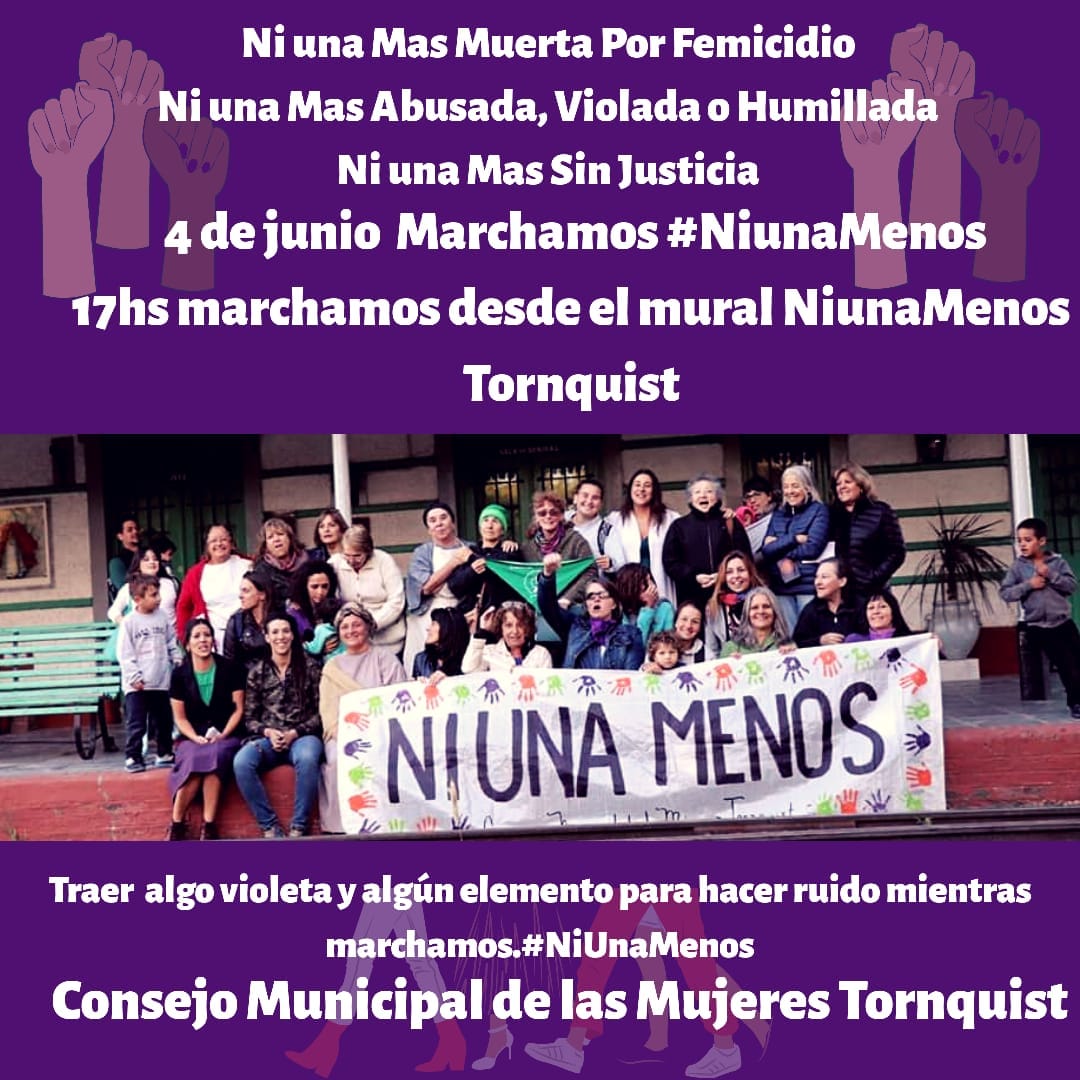 El martes 4 de junio, organizado por el Consejo Municipal de las Mujeres de Tornquist, se continuaran con las actividades en el marco de “NI UNA MENOS”: