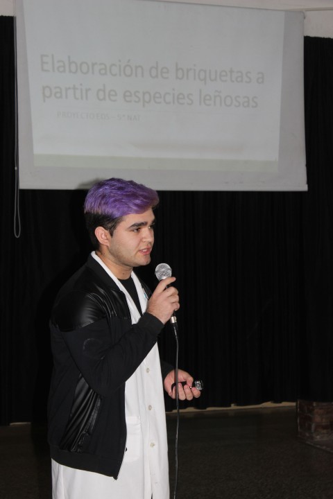 Uno de los proyectos expuestos este miércoles fue la fabricación de briquetas a partir de especies exóticas invasoras a cargo de alumnos de 5° Naturales de la EES N° 3. “Lo organizamos el año pasado en un curso y se trata de hacer briquetas a partir de chips leñosas y de restos de poda”, explicó la docente Silvina Raitzin.