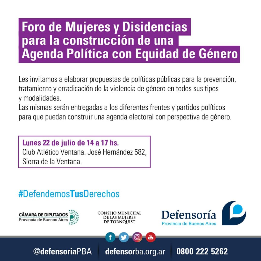 EL 22 DE JULIO DE 14 A 17, EN EL CLUB ATLÉTICO VENTANA de Sierra de la Ventana se llevará a cabo el FORO DE MUJERES Y DISIDENCIAS PARA LA CONSTRUCCIÓN DE UNA AGENDA POLÍTICA CON EQUIDAD DE GÉNERO, que promueven y organizan la Secretaría de Política de Género, Niñez y Adolescencia de la Defensoría del Pueblo de la Provincia de Buenos Aires, la Cámara de Diputados de la Provincia de Buenos Aires y el Consejo Municipal de las Mujeres de Tornquist.