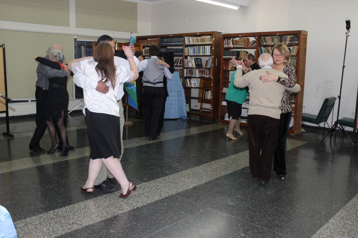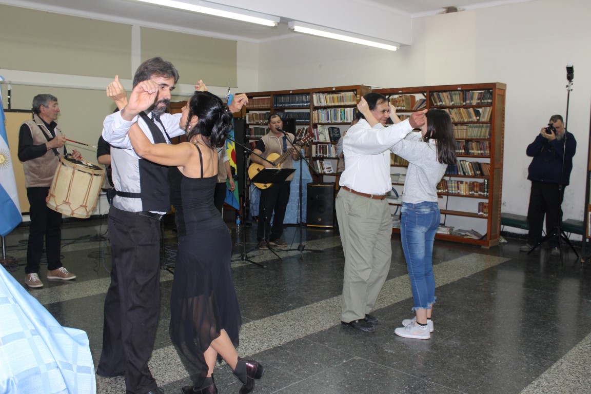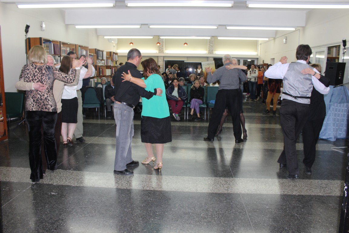 Se hizo presente el taller de tango del Centro de Jubilados y Pensionados sacándole “viruta” al piso de la Biblioteca Popular.