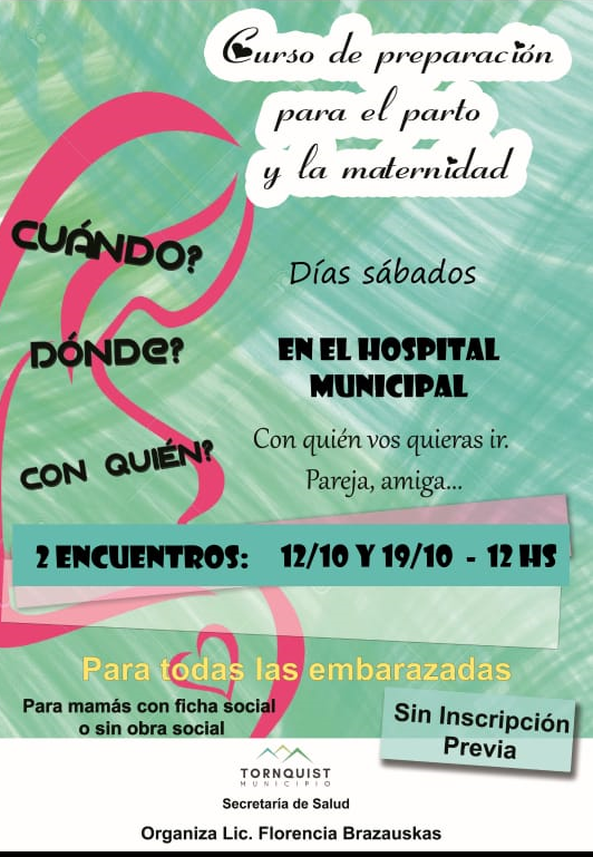 La Secretaría de Salud informa que se dictará un curso intensivo de “Preparación para el parto y la Maternidad”, los días 12 y 19 de octubre, a las 12hs en instalaciones del Hospital Municipal.