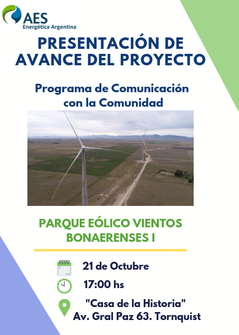 Torquist Municipio informa a la comunidad, que personal de la empresa AES “Energética Argentina”, que se encuentra a cargo de la construcción del parque eólico “Vientos Bonaerenses I”, brindará una charla informativa el próximo 21 de octubre, a las 17hs, en el Museo Casa de la Historia (Av. Gral Paz 63).