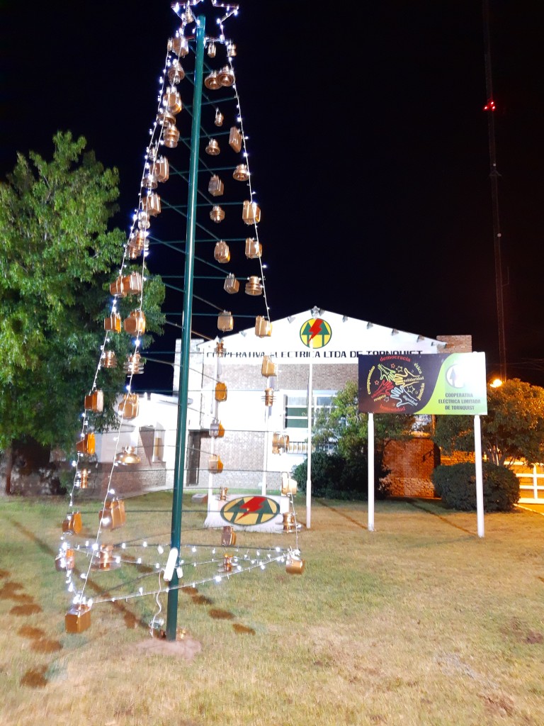 También el personal de la Cooperativa Eléctrica se sumó con su arbolito artesanal reciclando elementos en desuso y fue colocado frente a la sede de la CELT.