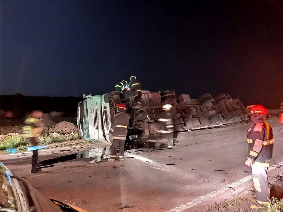 Los bomberos voluntarios en conjunto con policía, inspectores de tránsito y personal de salud, trabajaron esta madrugada en el lugar, ya que parte del transporte quedó sobre la carretera y debieron cortar una mano.