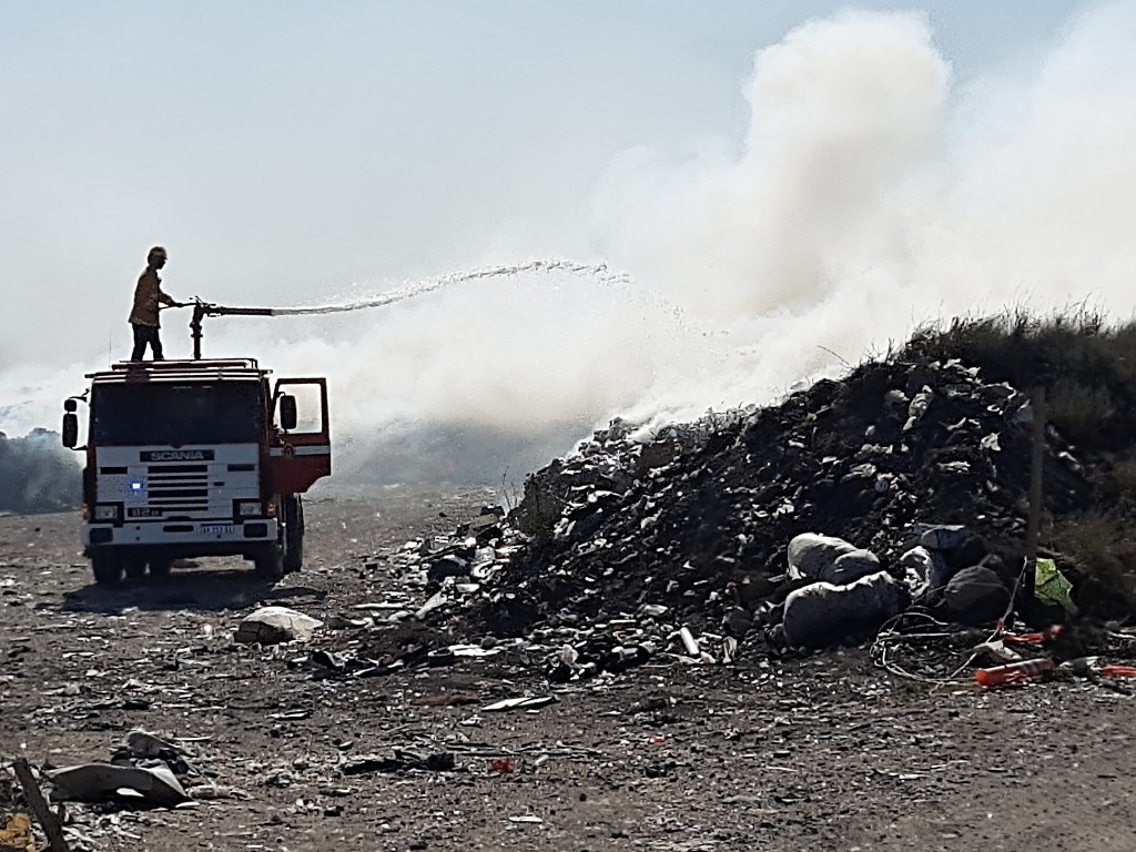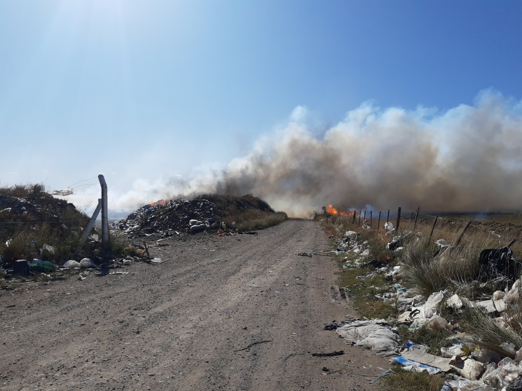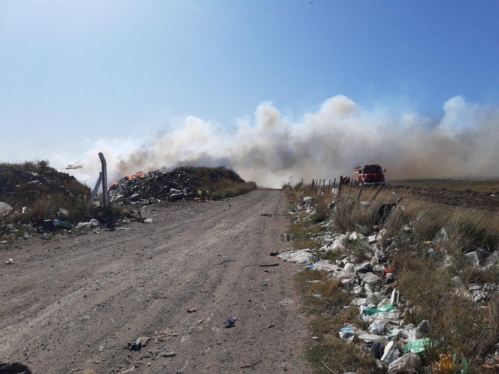 Los bomberos combaten un incendio en un sector del basurero municipal que, por efecto del fuerte viento que sopla del sud oeste, también afectó pastos en el terreno del Aero club de Tornquist.