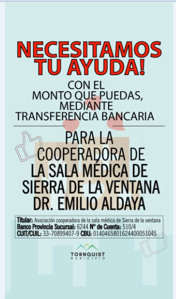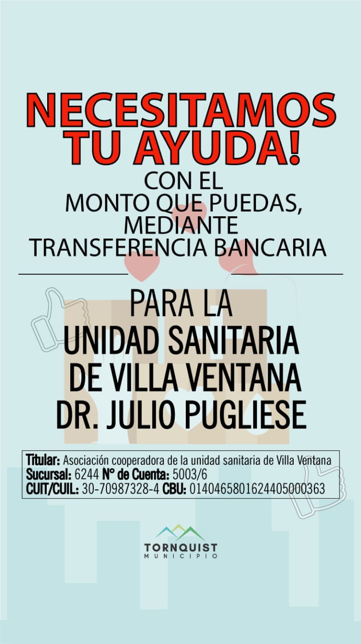 Sala Médica “Dr.Julio Pugliese” C.B.U: 0140465801624405000363 – Asociación Cooperadora de la Sala Médica de Villa Ventana N° de Cuenta: 5003/6 / Cuit: 30-70987328-4.