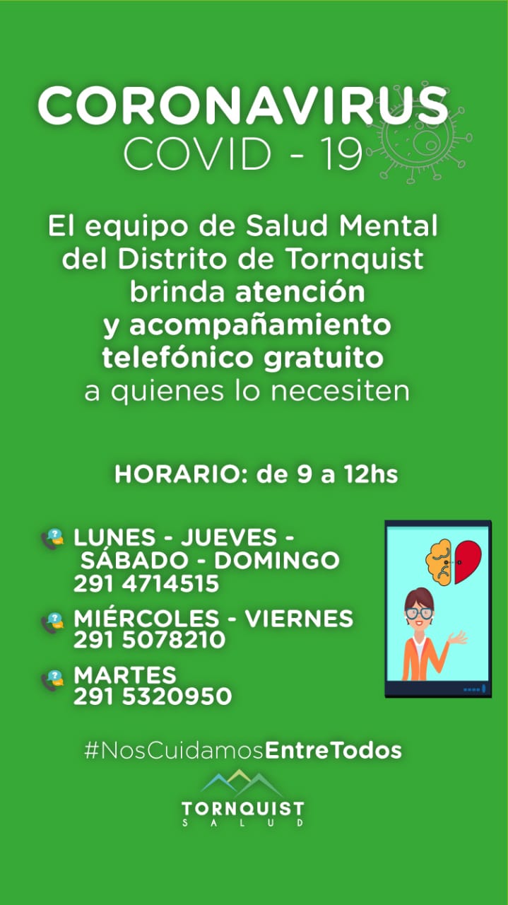 La Secretaría de Salud municipal, a través del equipo de Salud Mental, recuerda que los vecinos tienen a disposición líneas telefónicas para acompañamiento psicológico en esta situación de aislamiento que estamos enfrentando.