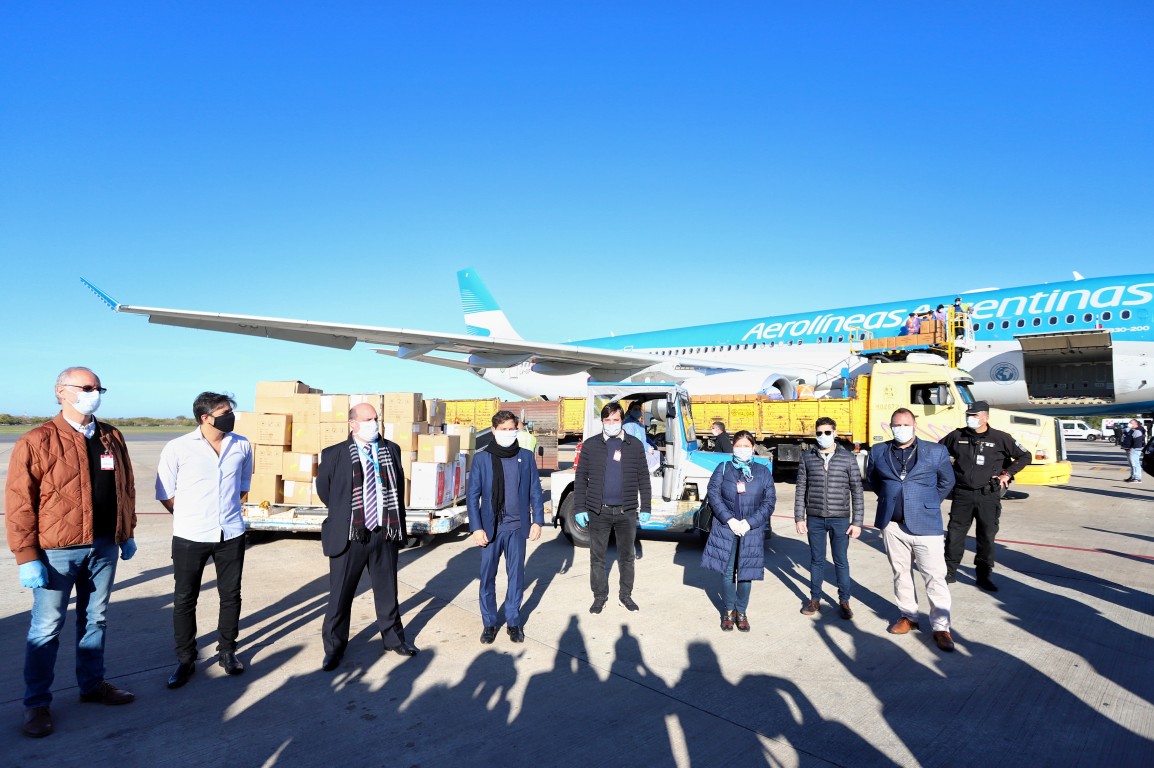 El gobernador de la provincia de Buenos Aires, Axel Kicillof, recibió este sábado junto al presidente de Aerolíneas Argentinas, Pablo Ceriani, y el ministro de Salud, Daniel Gollán, al avión de la aerolínea de bandera que llegó desde China con insumos para uso médico.
