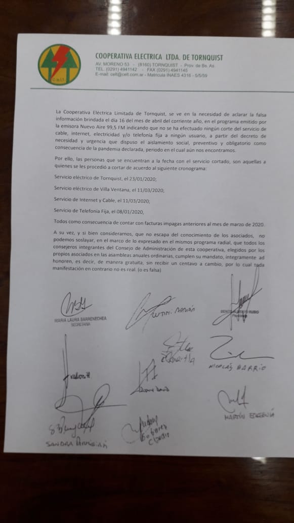 La Cooperativa Eléctrica Ltda. de Tornquist se ve en la necesidad de aclarar la falsa información brindada el día 16 el mes de abril del corriente año, en el programa emtido por la emisora Nuevo Aire 99.5 FM , indicando que no se ha efectuado ningún corte del servicio de cable, internet, electricidad y/o telefonía fija a ningún usuario, a partir del decreto de necesidad y urgencia que dispuso el aislamiento social, preventivo y obligatorio como consecuencia de la pandemia declarada, período en el cual aún nos encontramos.