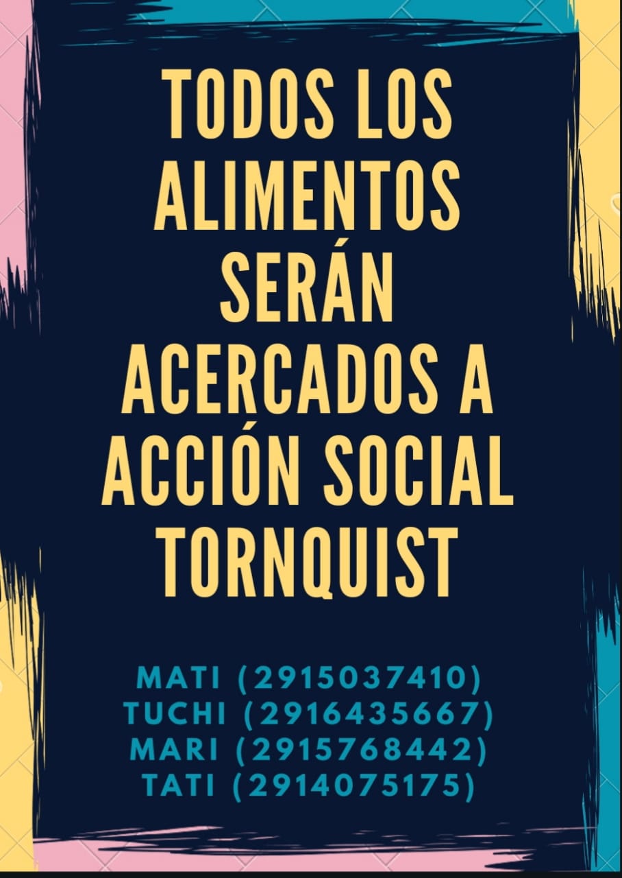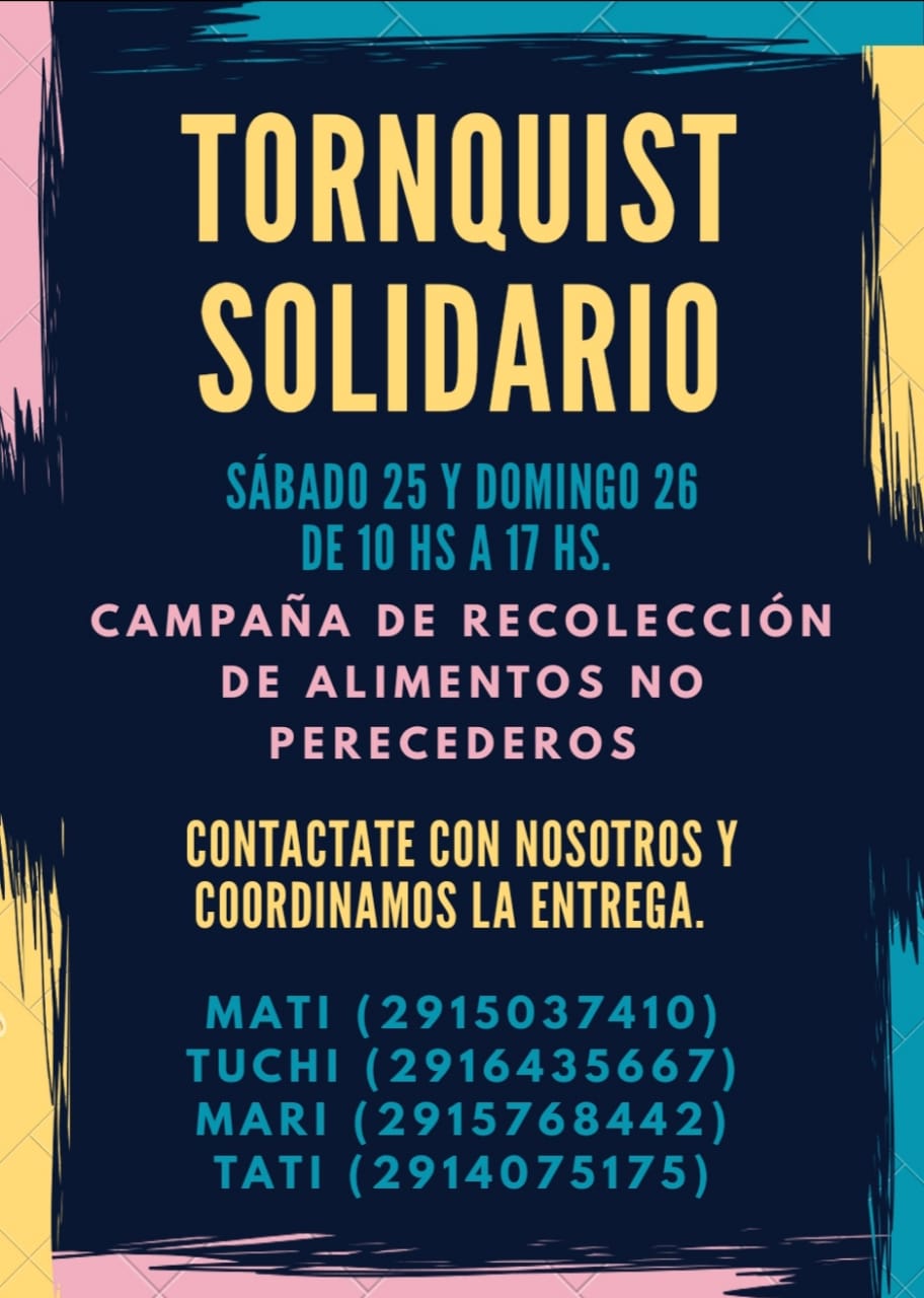 Con la denominación TORNQUIST SOLIDARIO Jóvenes de nuestra ciudad organizan una campaña solidaria reuniendo alimentos no perecederos para ser distribuidos, a través de Acción Social, a las personas con mayor necesidad.