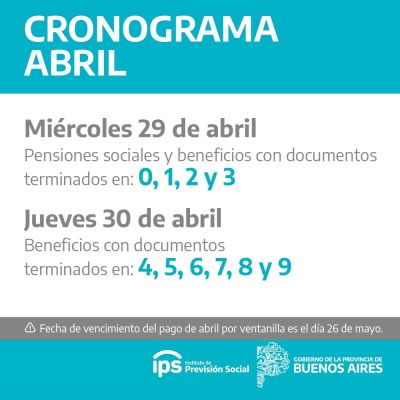 El Instituto de Previsión Social Bonaerense (IPS) informa que los jubilados y pensionados de la Provincia de Buenos Aires percibirán los haberes correspondientes al mes de abril entre el miércoles 29 y el jueves 30, según cronograma que se detalla a continuación: