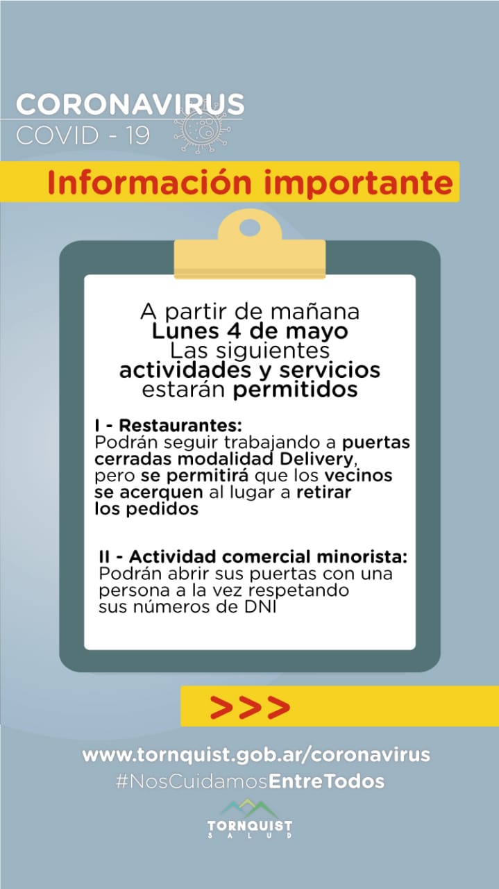 Tornquist Municipio informa que con el fin de comenzar a reactivar los circuitos económicos dentro del distrito, y considerando que no tenemos casos de Covid-19 en el mismo, se ha decidido ampliar el listado de actividades que podrán desarrollarse dentro del aislamiento administrado.