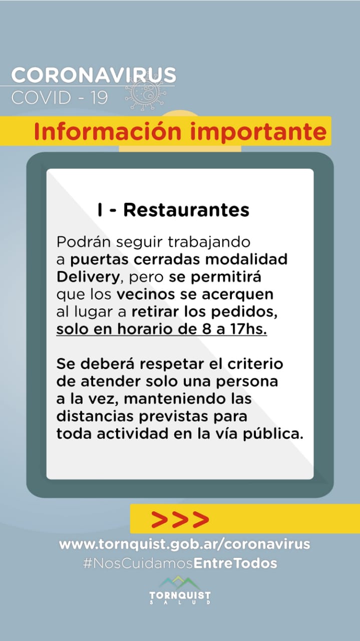 - Seguirán con el acceso cerrado a clientes para ocupar mesas o sillas del local, podrán seguir vendiendo con el modo delivery, pero se permitirá también a los clientes que puedan recoger los pedidos en el comercio ingresando al mismo. Se deberá respetar el criterio de atender solo una persona a la vez, manteniendo el distanciamiento social exigido. Los horarios de atención continúan siendo los mismos, de 8 a 17 podrán hacerlo en modo delivery o bajo esta nueva modalidad, y de 20 a 23 hs podrán comercializar sólo con la modalidad de entrega a domicilio.