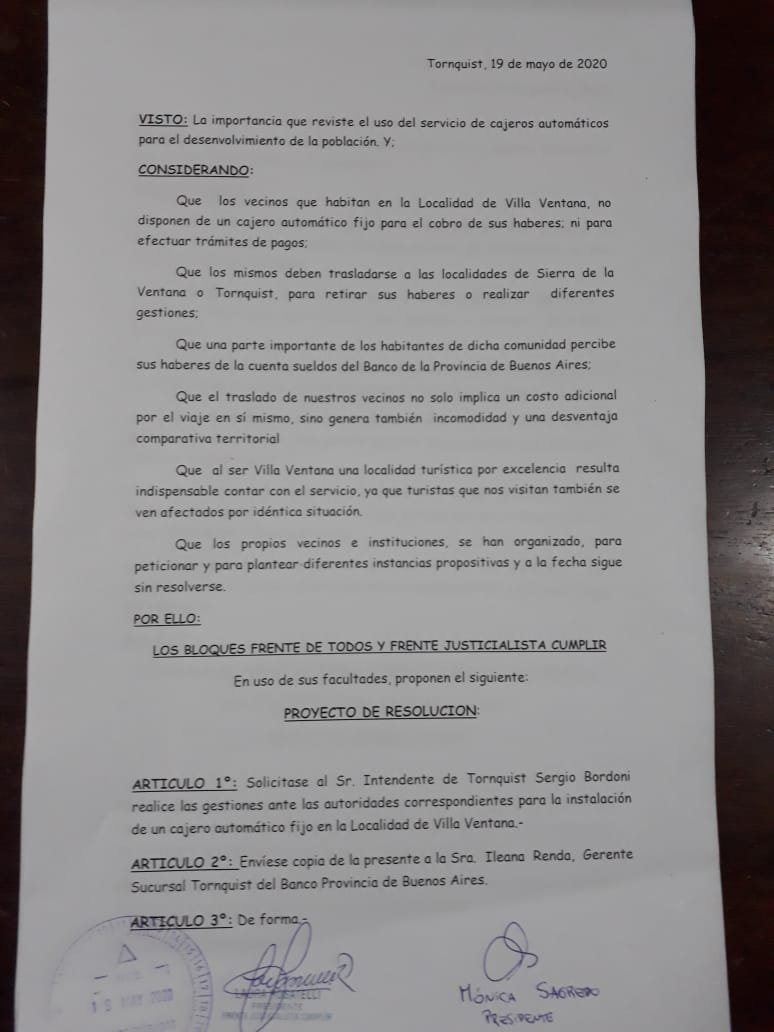 • La importancia que reviste el uso del servicio de cajeros automáticos en la localidad de Villa Ventana ya que los habitantes de dicha localidad deben trasladarse a otra ciudad para el cobro de sus haberes y que al ser ésta una localidad turística resulta indispensable contar con el servicio. Por todo esto decidimos presentar el proyecto de resolución dónde proponemos la instalación de un cajero automático fijo para saldar el pedido de los habitantes que llevan años esperando.