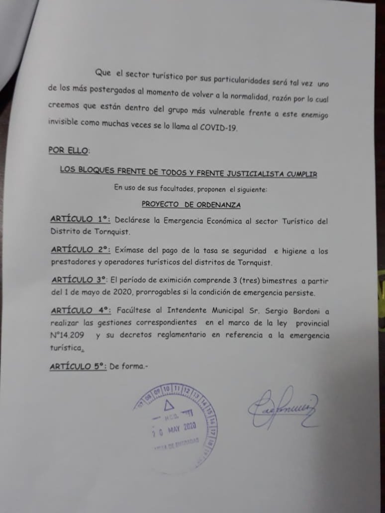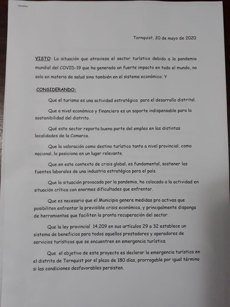 • Teniendo en cuenta la situación que atraviesa el sector turístico debido al covid 19 y sosteniendo que es una actividad estratégica para el desarrollo distrital vemos necesario que el municipio genere medidas pro activas que posibiliten enfrentar la crisis económica. Por todo ello, los concejales presentamos este proyecto de ordenanza con el objetivo de declarar la emergencia turística en el distrito, como así también eximir del pago de la tasa de seguridad e higiene por el lapso de tres bimestres prorrogables  a los prestadores y operadores turísticos del Distrito de Tornquist.