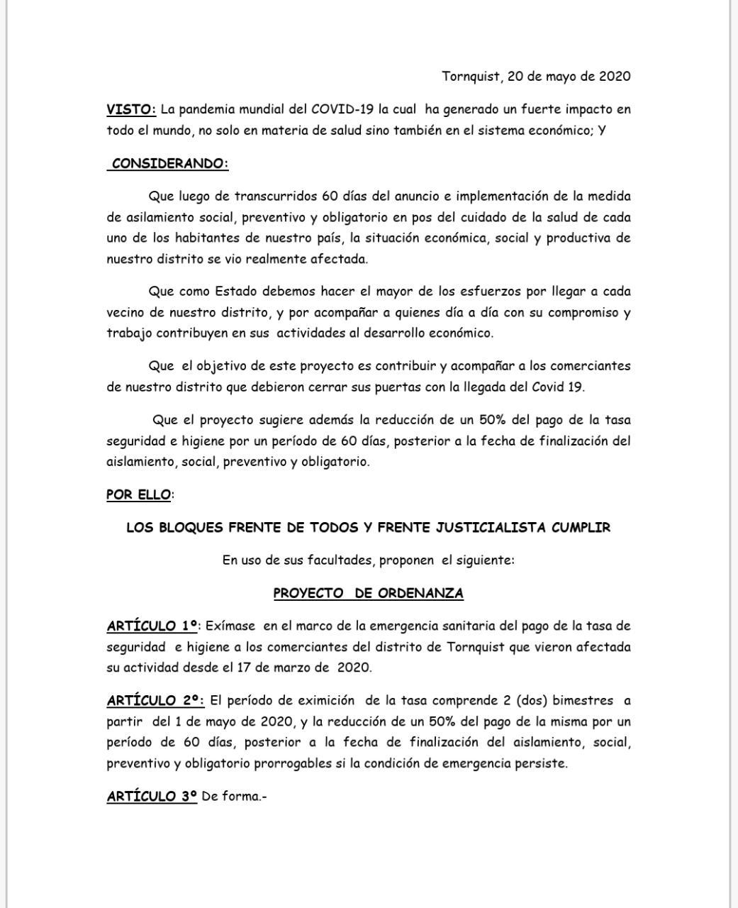 • Con el fin de contribuir y acompañar a los comerciantes de nuestro distrito que no pueden trabajar por el covid 19 presentamos un proyecto de ordenanza dónde se exima el pago de la tasa de seguridad e higiene a dichos trabajadores por el lapso de dos bimestres y la reducción del 50% del pago de dicha tasa por un periodo de 60 días cuando finalice la pandemia.