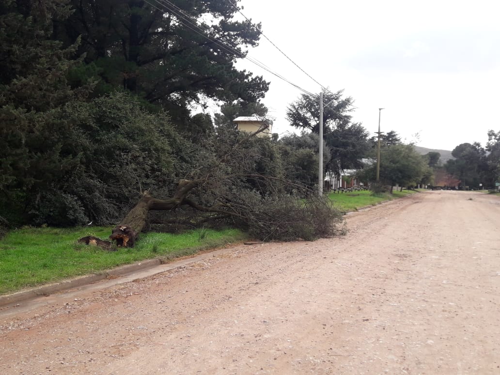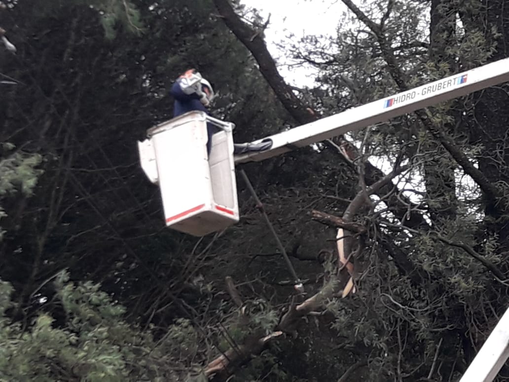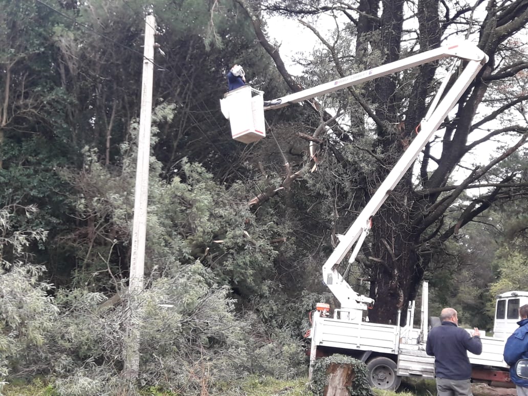Personal de la Cooperativa Eléctrica de Tornquist apostado en Villa Ventana continuaba trabajando esta mañana para reponer el servicio a varios usuarios que quedaron sin energía producto de la caída de ramas y árboles, en algunos casos sobre las líneas de tensión.