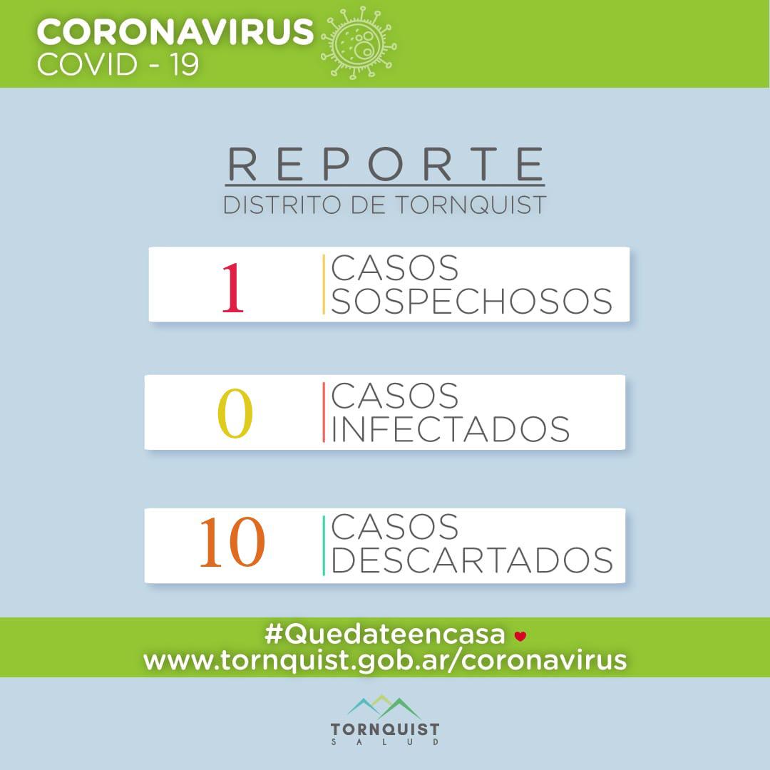 El último reporte emitido por la Secretaría de Salud de la Municipalidad de Tornquist, que se dio a conocer en el atardecer de éste martes, informa de un nuevo caso sospechoso en el distrito de Tornquist y 10 descartados.