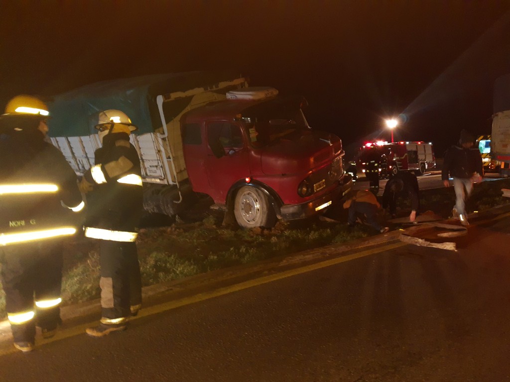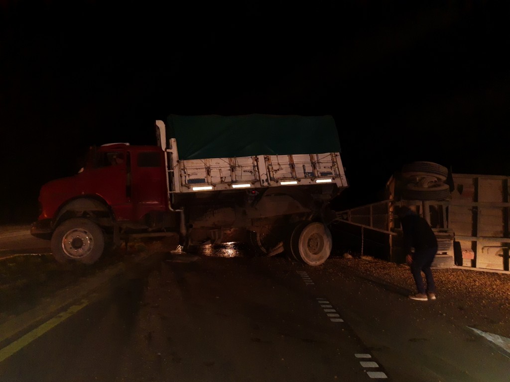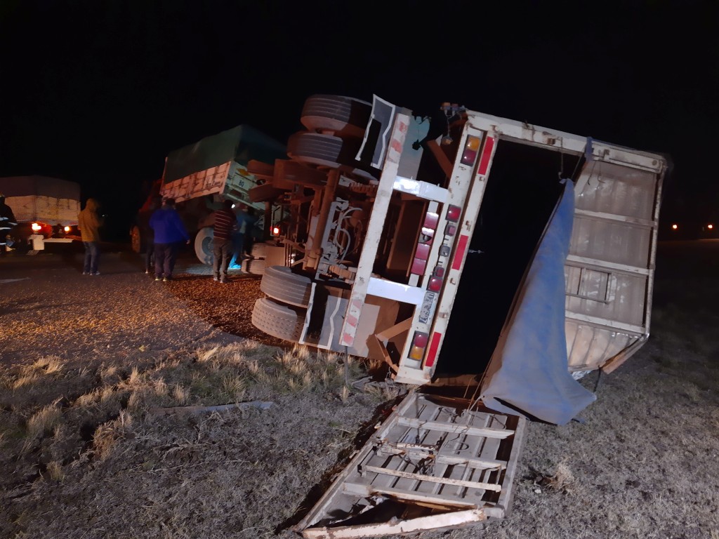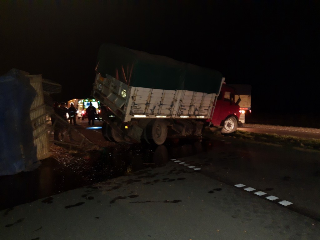 En el lugar un camión cerealero Mercedes 1114 dominio RPH9T3, conducido por Marcos Gastón Milla con domicilio en la ciudad de Huanguelen, sufrió un desperfecto mecánico generando un efecto tijera y el vuelco del acoplado montenegro dominio UZN 697, quedando literalmente cruzado sobre el pavimento.