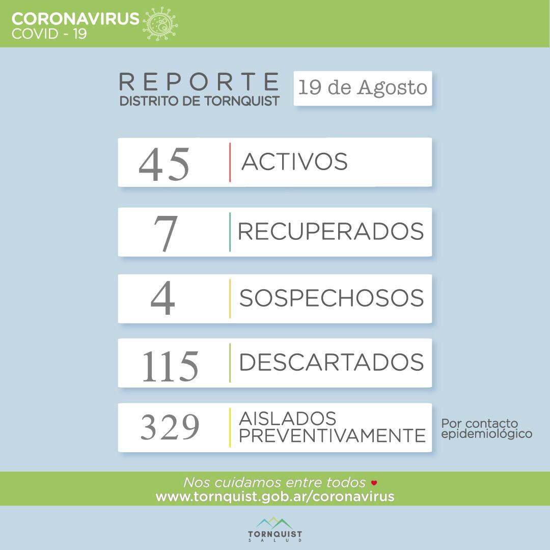 <a href="http://www.celttv.com.ar/?attachment_id=51427" rel="attachment wp-att-51427"><img class="alignleft size-full wp-image-51427" src="http://www.celttv.com.ar/wp-content/uploads/2020/08/848.jpg" alt="" width="1080" height="1080" /></a>En su habitual reporte la Secretaría de Salud del distrito de Tornquist informó que se reportaron 45 casos activos, 7 recuperados, 4 sospechosos, 115 descartados y 329 aislados preventivamente.