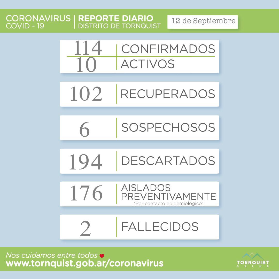 En su habitual informe la Secretaría de Salud del Distrito de Tornquist reportó esta noche 114 casos confirmados de los cuales actualmente hay 10 activos, 102 recuperados, 6 sospechosos, 194 descartados, 176 aislados preventivamente y 2 personas fallecidas.