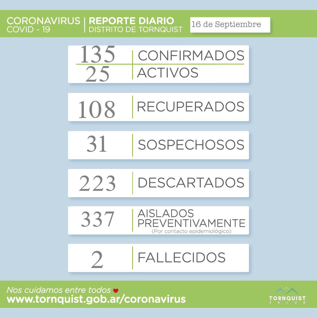 El informe emitido esta noche por la Secretaría de Salud del Distrito de Tornquist reportó 135 casos confirmados, 25 activos, 108 recuperados, 31 sospechosos, 223 descartados, 337 aislados preventivamente y dos personas fallecidas.