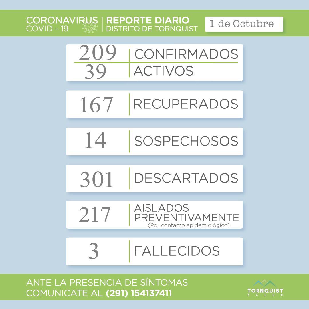 Ahora son 209 los casos confirmados, de los cuales 39 son activos, hay 167 recuperados, 14 sospechosos, 301 descartados, 217 personas aisladas preventivamente y 3 fallecidas.
