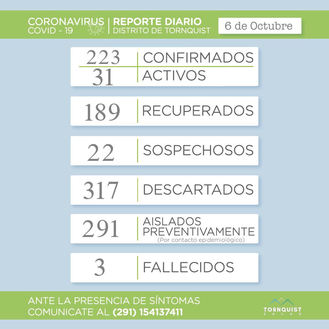 Se reportaron esta tarde 5 nuevos casos positivos y hay 22 sospechosos.Ahora los casos confirmados suman 223, 31 de los cuales están activos, hay 189 recuperados, 22 sospechosos, 317 descartados, 291 personas aisladas y 3 fallecidas.