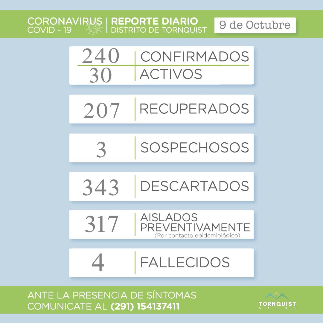 La secretaría de Salud del Municipio de Tornquist, informó que se sumaron cuatro casos positivos, donde los activos alcanzan los 30 (Totalizando 240), 207 recuperados, tres sospechosos, 343 descartados, 317 personas aisladas de manera preventiva y cuatro fallecidos.