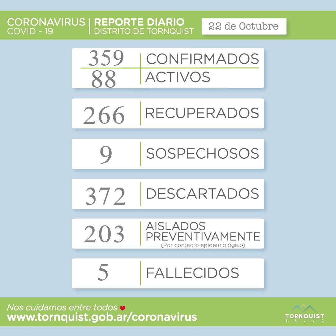 Ahora los casos confirmados son 359, 88 de los cuales son activos. Hay 266 recuperados, 9 sospechosos, 372 descartados, 203 aislados preventivamente y 5 personas fallecidas.