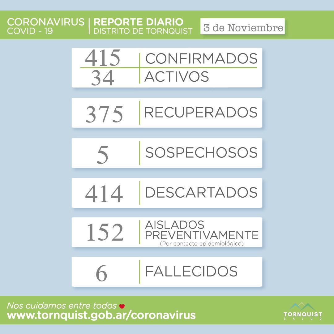 Ahora los confirmados suman 415, de los cuales 34 permanecen activos (Tornquist 27, Chasico 3, Sierra 3 y Saldungaray 1), hay 375 recuperados, 5 sospechosos. 414 descartados, 152 personas aisladas preventivamente y 6 fallecidas.