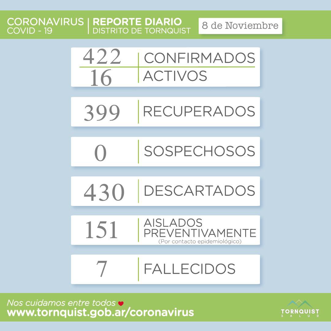 La Secretaría de Salud del distrito de Tornquist reportó éste domingo un nuevo caso activo de coronavirus. Ahora suman 422 los casos confirmados, de los cuales 16 se mantienen activos. Hay 399 recuperados, ningún sospechoso, 430 dscartados, hay 151 personas aisladas preventivamente y 7 fallecidas.