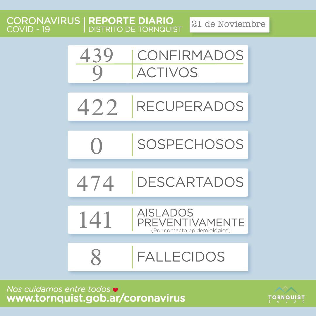 Hasta el momento son 9 casos activos, 439 confirmados, 422 recuperados, ningún sospechoso, 474 descartados, 141 personas aisladas de manera preventiva y 8 fallecidos.