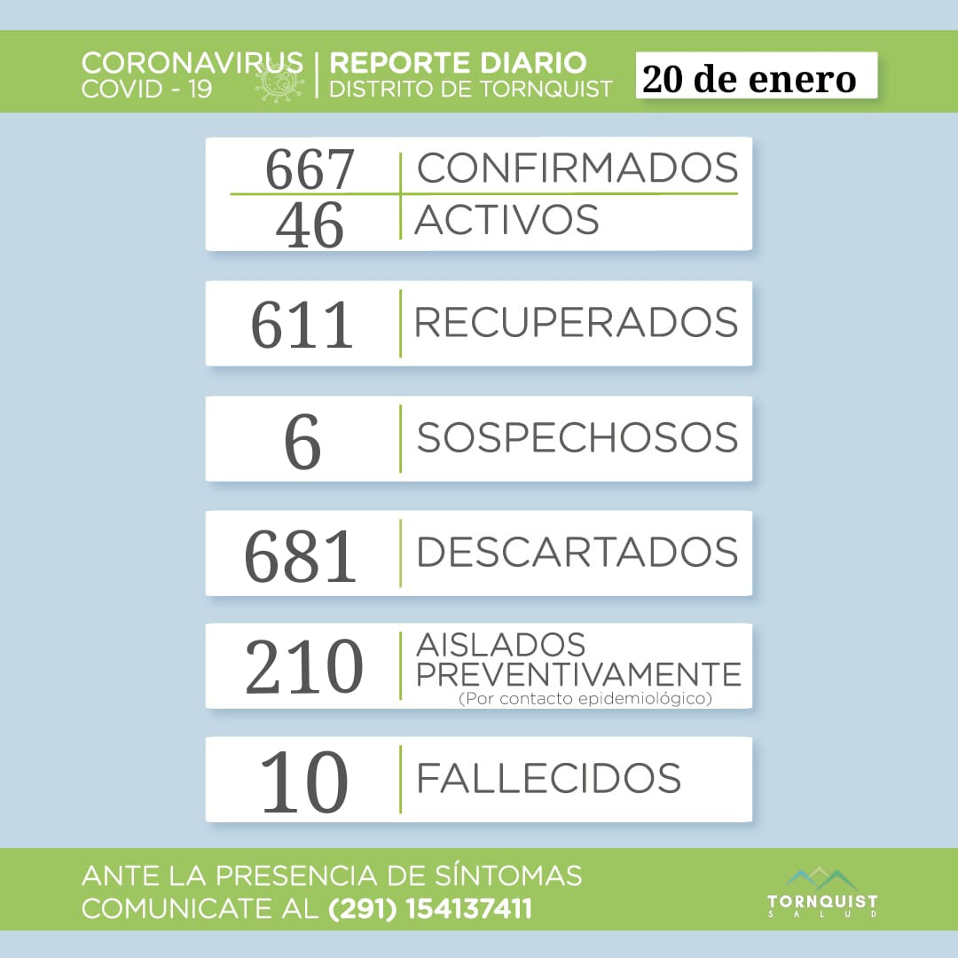 En su reporte de esta mañana la Secretaría de Salud del distrito de Tornquist informó 3 nuevos casos positivos y 3 recuperados. Ahora suman 667 los casos confirmados, de los cuales 46 se mantienen activos y hay un total de 611 recuperados y 6 sospechosos. 681 descartados, 210 personas aisladas preventivamente y 10 fallecidos.