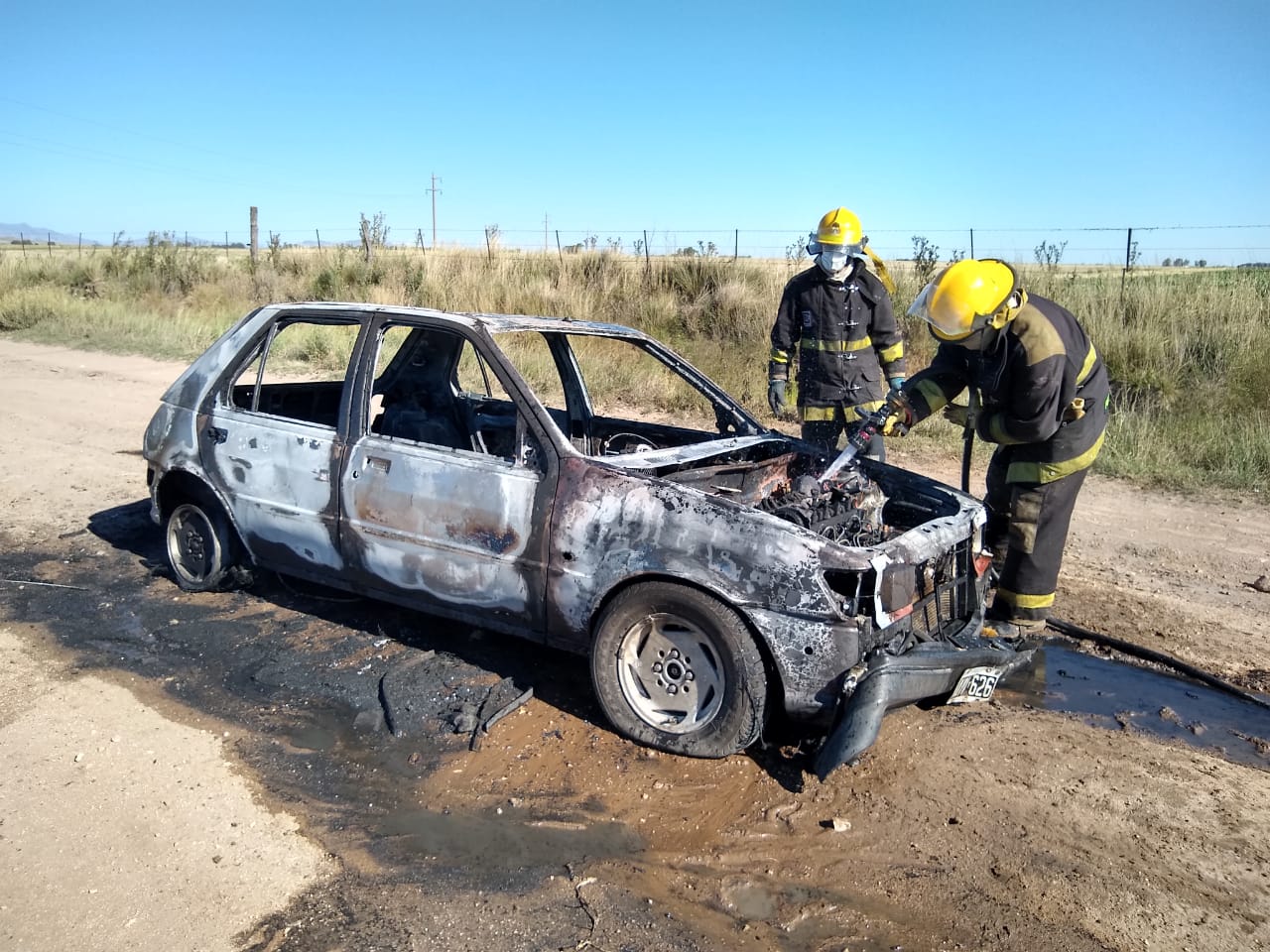 Se trataba de un Ford Fiesta modelo 96, propiedad de Damián Riera, que se desplazaba sentido este-oeste; momento en que advirtió las llamas provenientes del sector del motor y poco pudo hacer para evitar que en minutos afecten la totalidad del rodado.
